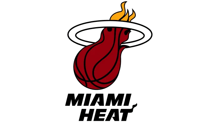 设计中是一颗被拉长的燃烧着的篮球,尾部有清晰可见的火焰,篮球上有独特的白色线条,正穿过一个黑色的篮筐。下方分两行写着“MiamiHeat”的字样。