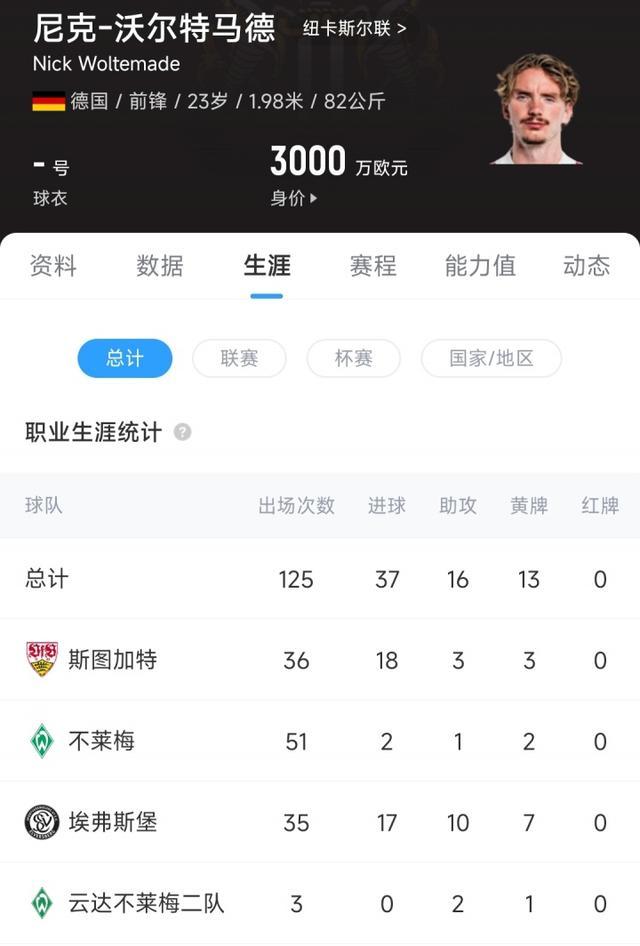 直播吧08月30日讯 官方消息,纽卡斯尔从斯图加特签下23岁的沃尔特马德,德转数据显示,沃尔特马德的转会费为8500万欧元。